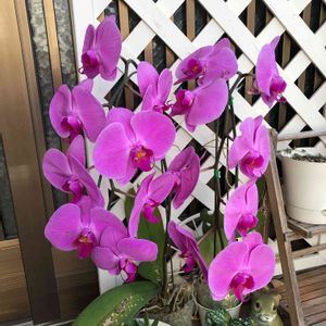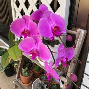 頂き物の胡蝶蘭♡ 大輪白とピンクを頂きました。 白は今2番花が咲いてます😊 ピンクの方は 6株ある内の5株に新芽が出て来てます( ˃̶͈ ᴗ ˂̶͈ )♡ 庭に放置なので💧カタツムリに食べられたりで 葉っぱはボロボロです(>_<;)