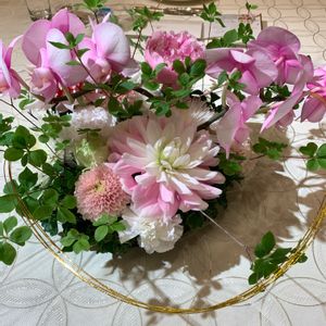 ママ友の娘さんが昨年結婚したのですがコロナ禍で延期になっていた結婚式が本日無事に出来ました💒 幼なじみの娘だけならずママ友3人も招待頂きました。 コロナ禍でアルコールの提供なし余興なしスピーチなしでしたがとてもいいお式で幸せな気持ちになりました🥰 各テーブルのお花もそれぞれ違い写真いっぱい撮りたかったけれどコロナ禍であまり席を立つ事もできずこちらも自分の前しか撮影できませんでした🤣