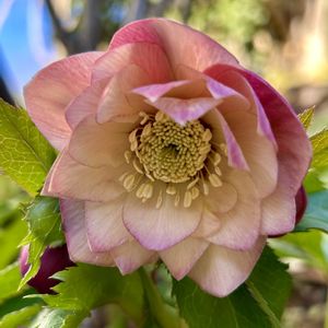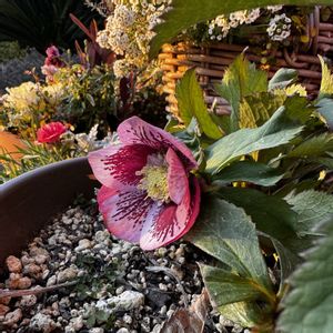 クリスマスローズ クランベリーシフォン🌸 今年はゆっくり開花のよう。。。 今日の夕焼け時間にパチリ✨