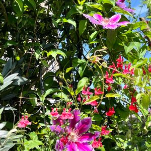 クレマチスとチェリーセージ クレマチス キンポウゲ科センニンソウ属 チェリーセージ シソ科アキギリ属 4月23日、12:07のクレマチスとチェリーセージ 今日は朝から冷たい雨がシトシト降っています 明るい爽やかな花を楽しんで下さい 🏷ピンクワールドへようこそ 🏷真っ赤な火曜日 🏷ファンタスティックブルー 🏷️あっ火曜日