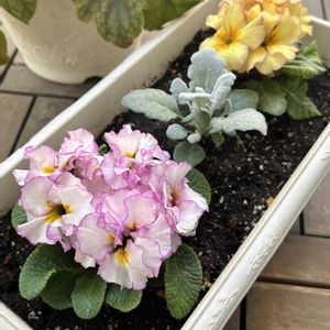 おはようございます🎀 晴れて☀️いい天気です 1️⃣プリムラ✨プランターにシロタエギクと植えました🎶 2️⃣シルバーリーフの金魚草・アールグレイ✨茎がしっかりしていて葉もふっくら☺️花が楽しみです😁