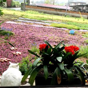 今朝起きたら外一面ピンク色の絨毯になっていたにゃん🐈🌸 クンシランも咲いたよ🌺