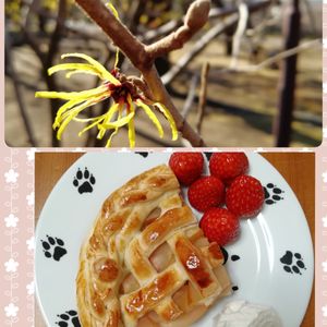 こんにちは😊 ⬆️公園の🌼マンサク🌼 ⬇️娘のリクエストで 作ったアップルパイ😋🥂 皆さんいい午後を🎶