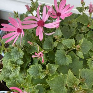 ホームセンターでお迎えしました(*^^*) 木立セネシオ桂華 コスモスのようなお花 花びらは個体によって幅が太めのと細めのがありました。サイネリアの原種と交配して品種改良されただけあってサイネリアに似ています。