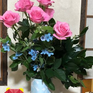 こんにちは😊🌤お花屋さんへ 行きました。きれいなお花を 買って来ました「バラ🌹」 「ブルースター」「サカキ」です