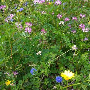 寒い朝😫散歩コース いろんな品種が沢山 れんげ草、矢車草、はなびし草 菜の花まだ名前解らない物も有り 風に揺れかわいい💞😄