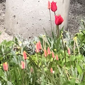 おはようございます😊🌹今日は とてもかわいい💕チューリップを🌷 見つけました それもご近所さんで 赤いのが普通サイズそのまわりが かわいい💕チューリップさんたち🌷