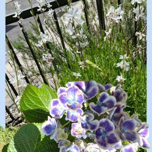 ガウラ🤍💚と紫陽花💟💟が 咲きました💠🌿💠🌿 ガウラは蝶が🦋飛んでるように ゆらゆら〜 紫陽花は剪定が✂️間違ってたのか? 3年くらい葉🍃のみ💦💦 今年は咲姿💟💟を見れてよかった😭