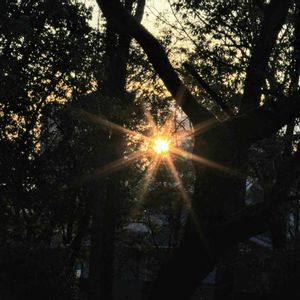 公園にて 武蔵野の林の向こうに、 夕陽が落ちていきました😄 ずっとカメラ覗いてたら、目が、目が! 目が見えなくなったー😎