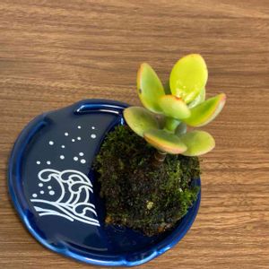 金の成る木 崩れかけた 苔玉の花月🌿苔玉 ノベルティのお皿にのっけて 庭に勝手に生えた苔で 苔玉作ってみました 糸や紐でグルグルしてないので 崩れかけて〼😆