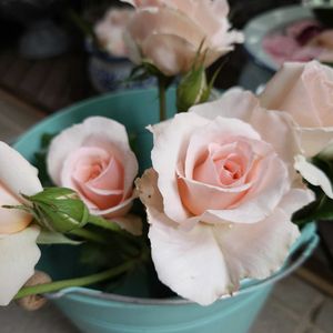 夜になると雨が降り出すそうで 開きかけたら傷む前のルーティン 今年は花付きが良いのに残念だけどカット🌹カット🌹カット🌹 モナコさんの中に白い蕾一つ こんな事はじめて どう咲いてくれるか楽しみ♥