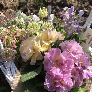寄せ植え🧺 プリムラジュリアン💕 大きな株だなぁと思ってたら、ラッキーなことに2色入ってました😅 ビオラ花糸 大好きなアリッサム✨ 白はもちろん、ミックスも可愛い😍