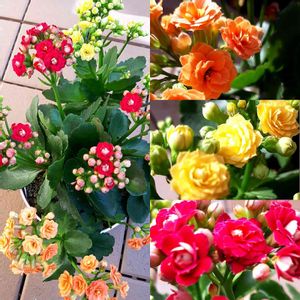 5色植えのカランディーバ❤💗💛🧡 八重咲きのカランコエです🤗 赤、黄、オレンジ、ピンク白ツートンの4色咲いてます🎵 濃いピンクがもう一歩😂💦 咲き方が密でムチムチ😆🎶
