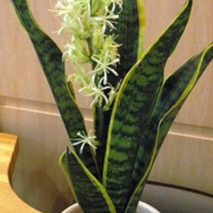 おはようございます😃 これは、うちのでは、ありませんが、ネットで調べたらサンスベリア、お花が咲くそうですね。こんなお花❣️ とても良い香りがするらしい✨😍 それには、先ず株を大きくする必要があるらしいです。 冬は休眠期に入るのでお水は、控えめ、春と秋に固形の肥料をあげたら良いらしいです。それとカーテン越しの日光も大切だそうです。それらが重なって運が良いとお花を見られるらしいです。 うちのもいつか咲いてくれるかしら⁉️😄🎶