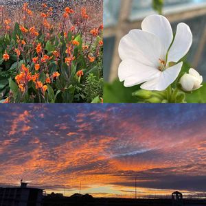 すみません💦 外に出たら久々の夕焼け❣️ 嬉しくて4投稿目ですがお許しを〜😉 19時半頃の空です 線路沿いのカンナとゼラニウムも😊