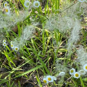 チガヤの綿毛まみれのヒメジョオン💠 雲か霞がかかったようです。 粘り気があるチガヤの綿毛は、1度くっつくとなかなか離れません💦