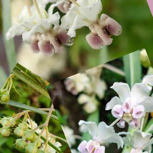 🌸アスクレピアスの花と 種のさやと 並んだ綿毛と 飛び立った後😘 昨日、種のさやが開いて お行儀良く並んだ綿毛が見えてたのよ! 今朝見たら、飛び立った後で😅もぬけの殻! どこに飛んでったの〜? 皆さんの所まで行ったのかなー🤭