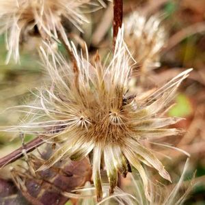 アザミが綿毛を飛ばした後の萼 ピカピカして(一部黒光り)長年大切にしている金のブローチのような風合いがあります。 殆ど見かけなくなった山野草 「私を見て」と話しかけられた気がしました。
