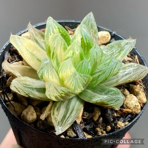 戦利品3 ハオルチアの斑入りコモモ 賞をとったコモモの斑が少し入ったものです。子株もついていましたが取れてしまったので別に植えました。 葉脈がかなり綺麗な模様と色です。