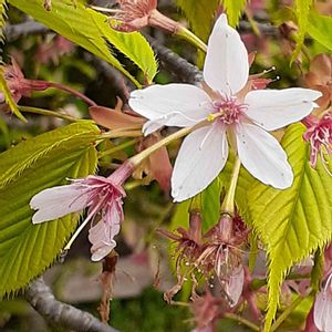 🔰🌸ハクサンハタザクラ(白山旗桜)なる品種のサクラと出会いました。 ハクサンハタザクラはオオシマザクラ系のサトザクラで原木は東京都文京区の白山神社にあった品種です。 原木は1935(昭和10)年に国の天然記念物に指定されましたがのちに枯死し(指定を)解除され現存しておらず現在のサクラは後継樹です。 平安時代、八幡太郎義家が奥州平定の途中、このサクラに旗を立てかけ戦勝祈願したと言う伝説があります。 花は大輪、白色の一重咲きのサクラで花びらの他に旗弁と言う花びらがあるのが特徴的です。 旗弁と呼ばれる花びらがあるサクラを旗桜と言うことから名称は白山神社由来の旗桜であるからだと思われます。 『🏷️太陽がくれた季節a』 『🏷️白輝美人』 『🏷️2025年櫻鐵サクラコレクション』 『🏷️2025年桜さくらサクラリレー』