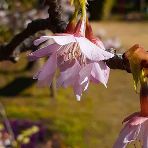 ハクサンハタザクラ🌸 一足先に春をお届けです🐝 それにしても開花が早いような‥🤔 下向きに咲いていました🌸 真っ白なお花もあるそうです✨ 5枚の花弁のほかに 雄しべが変化したらしい旗弁が3〜8枚🌸 見えづらいですが お花の中からぴよんと伸びたような花びらが旗弁です👀 白野江植物公園の芝生広場にて📸