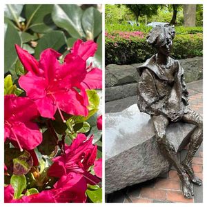 ねこたんぽさんの石の日に参加します🙋♀️ 国会図書館庭園内の石のベンチ。 ぴかぴかの座面に梢も映ってます🌿 後ろにあるのはサツキかなʕ•ᴥ•ʔ