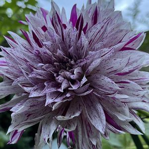 ダリア ワインシャワー 大輪 白の花弁に紫色の絞りでとても個性的です🍷 ワインのシャワーだなんて🎶 背が高くて見上げるとシャワーの🚿蛇口からワインを浴びている様です🍷🚿