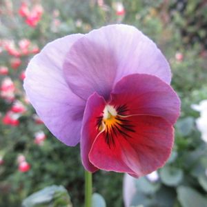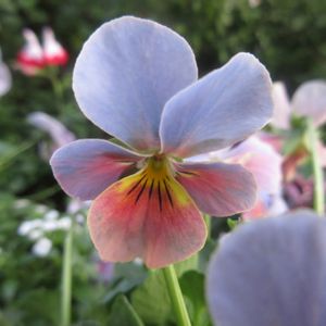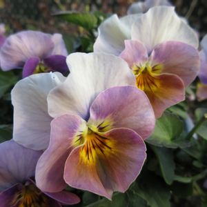 とっても気に入っているパンジー級の大きさのビオラです。横と上の花びらが紗がかかっている様な、ミルクの膜が張っている様な、そんな不思議で美しい花色をしています。