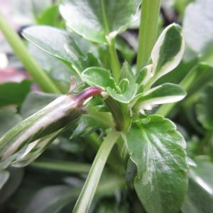 先ほどの斑入り葉に咲くビオラはこちらも斑入り。