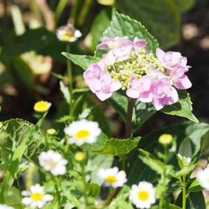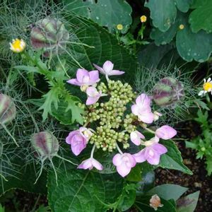 アジサイ城ヶ崎とノースポールとニゲラ。 いっぱいできたニゲラの種が思いの外邪魔なんですよ。