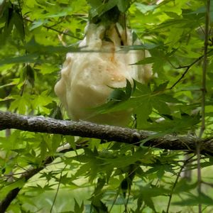 モリアオガエルの卵塊 いつもの場所で、今年も無事に産み付けられているのが確認出来ましたよ♪🐸 卵塊が見えるのは小さなカエデの木で、下は小さな池🟢 翼果の開き方や、上方向にあることからしてイロハモミジだと思うのだけれど🍁 今年は5つ確認いたしました ₍ᐢ_ᐢ₎