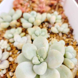 ほんのりピンクでまるまるの グラプトペタルム・だるま秋麗(秀麗)さん😻💗🤍 先日の大雨で 大きな葉っぱちゃんが落ちて ちびっこ軍団になっちゃいました😸💧