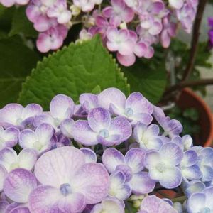 園芸店に並ぶ紫陽花シリーズ。 本日は 紫陽花 ポップコーン こちらは【隅田の花火】と並ぶくらい、様々な場所で見かけるメジャー級の品種。 そもそもは江戸時代に病気による突然変異から産まれた園芸品種。ですから、時代々で呼び名が色々あります。 “オタフクアジサイ”“ウズアジサイ”など、中にはピンクの場合は“オカメアジサイ”などとも言われているようです。 そんな事も背景にあるので、非常に日本の環境に合っていて育て易い上に花付きもいいです。持ってらっしゃる方はご存知だと思いますが、本当に😅育ちます。 花色は勿論 土のpHに左右されます。 咲き方はテマリから半テマリ。 面白いのは、昨今のハイドランジアは装飾花に隠れるように両性花を咲かせているのに対し、こちらは完全に混在してます。 なので、よくよく見るとシベがいるものも居たりする訳で、更に花弁もアシンメトリーなので、それぞれが妙に不揃いになって見ていて飽きません。 江戸時代から〜と 思うと 😊 ちょっと味わい深く見えて来ますよね💕