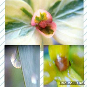 こんばんは🌃 マクロ撮影で遊びました✳️ この間からツルニチニチソウの先っぽが 紅ーく染まって来ているぞ♪ とワクワクしていたので💕 ツゲの芽🌱はキレイな色💚 水滴💧も初めて📸 📲ですけど😄 やっぱりブレました💫