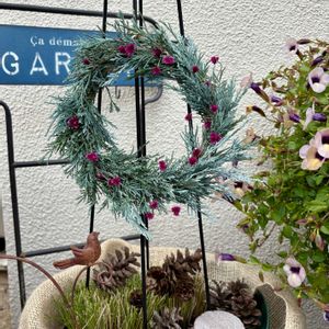 *コニファー *アルテルナンテラ ローザ お庭のもので手作りリース🎄 土台は、オリーブを剪定した時の枝を使用。 ミューレンベルギアを剪定して、 その鉢をそのまま使ってデコレーション。 短く刈られたミューレンベルギアが、いい感じです 笑