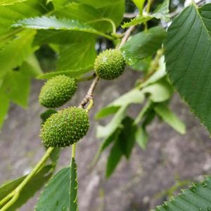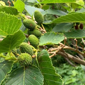 ヤシャブシ 💠✨ 若い実 道端シリーズ🌱✨(山道)です ザ~ンネ~ン😰💦 花💠はもう見られないようでした😢 葉っぱ🌱も繁ってきてて、 雄花序♂ も見られず、 雌花序♀ も赤い花💠は見えなくて、 若い実の状態になってるようです😌 花を見るなら、もっと早くじゃなきゃダメでしたね~😅 去年の実もまだ残ってて、 新旧の実が同居してました😄