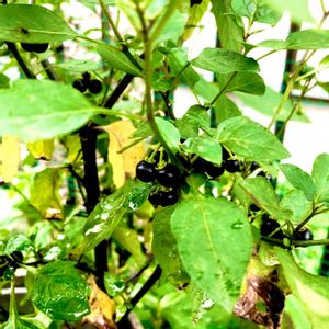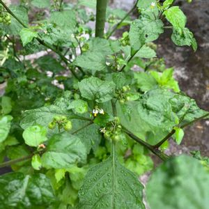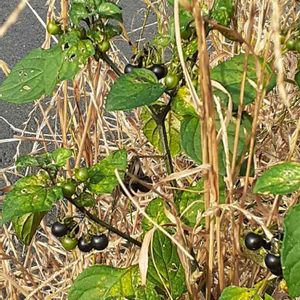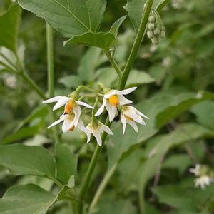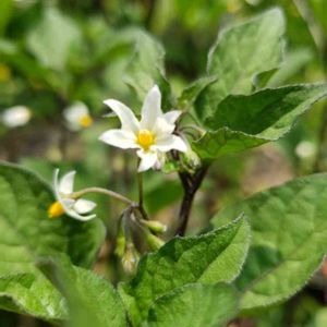🌱🌱🌱🌱🌱🌱🌱🌱 【イヌホオズキ】 ◇英名・Solanum nigrum L. ◇ナス科 ナス属 📕この名前は,役に立たない酸漿(ほおずき)との意味で、全草に毒があります☠️ 📕熱帯アメリカ原産の帰化植物で、畑の周辺や道端など見ることができます、高さは30〜60cm位枝先に径10〜12mmの白い☆星形の花🌼を数個つけます、実や植物全体に毒物のソラニンが含まれていますので、決して食べては❌果実は液質で球形、熟すると黒紫色になります。
