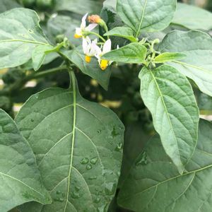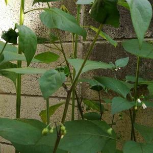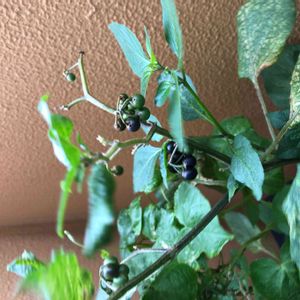 ほうづきの鉢に突然生えてきました。ナスの花に似てるけどトマトみたいな実もついてます。成長が早くてスクスクと伸びてほうづきが遠慮しながら同居してます。
