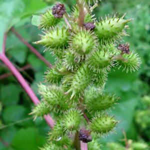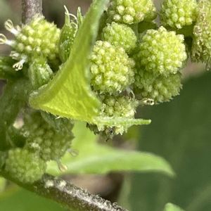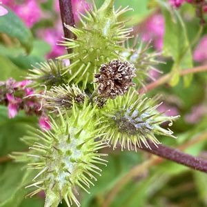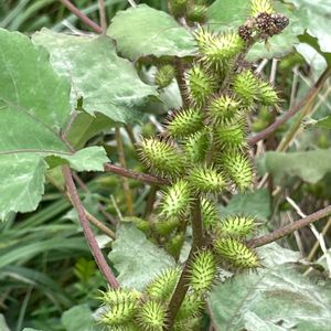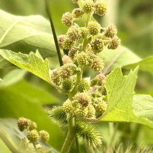 オオオナモミ 🏷️今日のお花 キク科オナモミ属の一年草 北アメリカ原産 雌雄同種。 近くの荒れた畑の一面に大きな葉とトゲトゲの種子を持つ特徴のあるオオオナモミが近寄りがたい表情で迎えてくれました・:*+.\(( °ω° ))/.:+ その種子は動物や人間の衣服に付着して移動拡散し、繁殖するのです。 もう大変です〜😂 このため、野生化が容易で、さまざまな環境に適応して広がることができます。 ○ 【大雄菜揉み】菜揉みは「古代の強壮薬”神麹”を作成する時、葉や青い実を揉んだ汁を米麹などに加えて作った。この時の動 作[菜揉み]が名前の基本になった」(山渓名前図鑑 野草の名前)という。 特徴: キク科はほとんどが虫媒花だけれど、オナモミ属は風媒花という。 葉はやや大きく、形状はカエデに似て3 - 5裂し、質は厚く、表面はザラザラとしている。鋸歯は尖らない。 花は秋に咲き、雌雄異花である。 雄花は枝の先の方につき、白っぽいボンボリ状になるが、雌花は緑色の塊状のものの先端にちらりと顔を出すのみである。