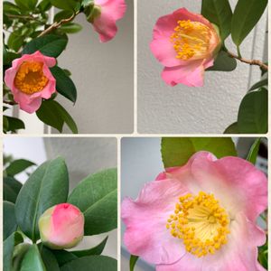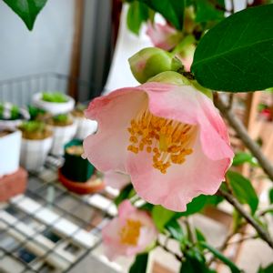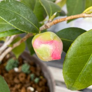 開花❣️ツバキ 天賜 緑の蕾購入から2ヶ月、↘️から2日☺️ 朝起きたらピンクの可愛い花が💕💕 うれしぃ(⌒▽⌒)