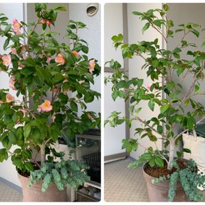 昨日、椿の花後の剪定と土替えを済ませました。(1週間前との比較) 枝を落としたので白い木肌が見えるようになりました。椿は木自体が色白で美人なんです✨ 足元のミセバヤも植え直したけど大丈夫👍🏻