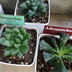 土を買いに地元のコメリに行ったら、「今日に限って」多肉が入荷しておる。 ついつい、ハオルチアさんたちと目と芽が合いまして離れられない運命に...。 手前のアドロミスクスは名前がわかったのてすが、左側と奥のハオルチア二人の名前がわかりません。ハオルチアってしか書いてないんだもん😓❓❓❓ どなたかご存知の方、教えてください。m(_ _)m