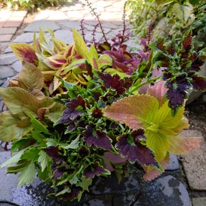🍀コリウス🍀 今年もコリウスあまり品数がありませんでした。😱😅💦 6種類植買って挿し芽で増やしました。🤗 道路側のいつもの長方形のテラコッタに植えています。 西日ガンガンでも毎年元気に育ちますよ。🥰