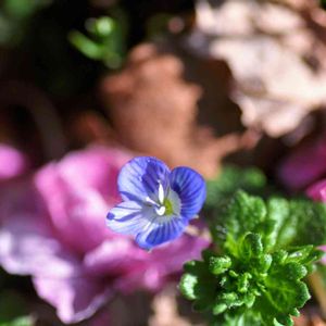 近所のプロムナードにて オオイヌノフグリ たくさん咲いて珍しくないけど、この青さはやっぱり素敵です。バックは落ち葉と小鳥が落とした梅の花です☘️