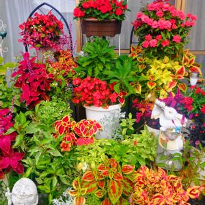 2025.11月1日🍂 暖色系エリアの植物達🌿 昨夜の豪雨で茎が延びてモリモリ状態になってます🪴 赤い花やカラーリーフなどの鉢を並べて楽しんでます🥰