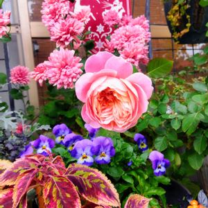 薔薇タペストリーとスプレーマム、ビオラ、栄養系コリウスの共演です🌿 栄養系コリウスが終盤でギリギリ共演が出来ました🥰