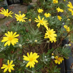 放ったらかしシリーズ… ユリオプスデージー 元気色✨ 撮るときに枯れ葉いっぱい取ったよ(笑)