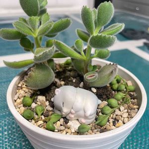 熊童子の鉢にガチャのハムスターちゃん、そして切れてしまったグリーンネックレスを入れておいたら根付いたみたい👍