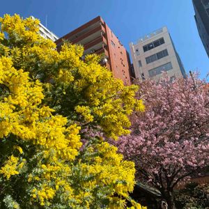 神社の屋根とミモザ🌼 都会の真ん中の街の鎮守様です。 ほんとに小さな小さな神社⛩ですが ミモザと桜そして椿が満開でとても素敵でした。 いろんなお花が咲いている季節に 遠くまで出かけられないけれ今です🥲 歩いていけるほど近所に こんな素敵な場所があると うれしい💕💕