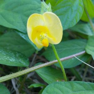 ヤブツルアズキ 川の土手に葉っぱでこんもりした場所が有るのですが、 上から眺めるだけでは花が咲いてるかどうか分かりません。 斜面を降り葉っぱを捲ってみると 咲いていました😃 左右の翼弁が竜骨弁にかぶさります。 右翼弁がイヤリングのようにみえます。 果実は線形でアズキに似ます。
